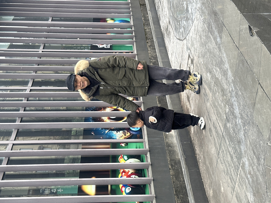 An elderly man in an olive green coat with a fur-lined hood and a cap holds hands with a young child wearing a black quilted jacket and black pants. They are standing on a sidewalk next to a building with large windows covered with metal slats. Posters are visible behind the slats. The sidewalk appears to be slightly wet or glossy.