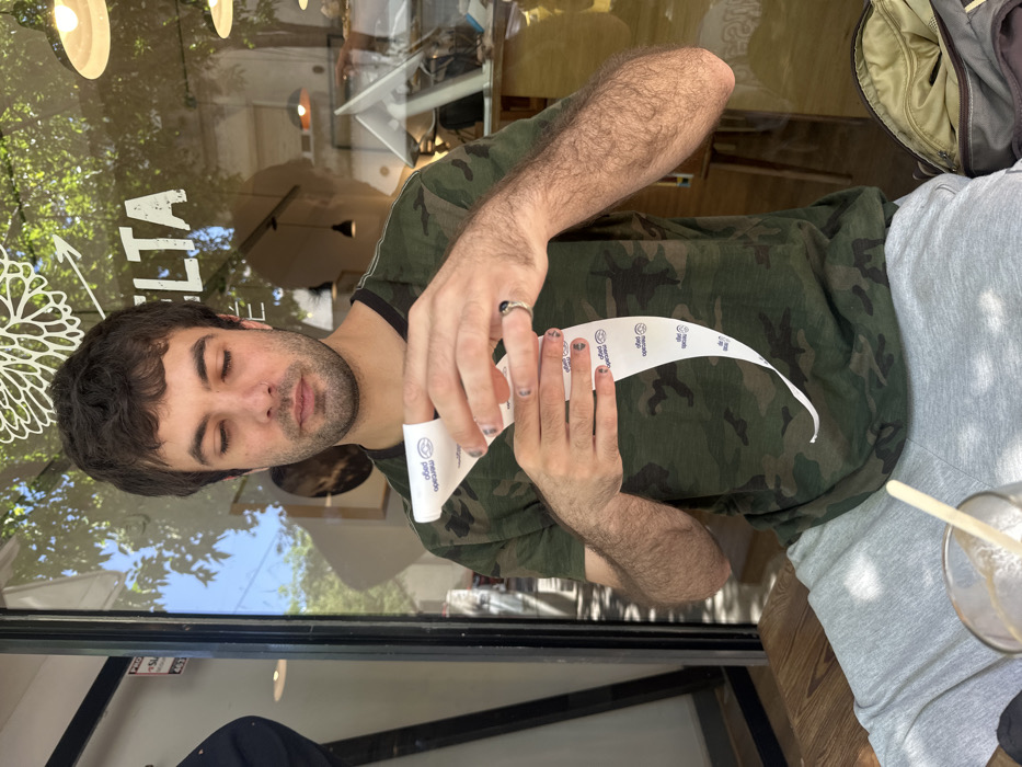 A man in a camouflage shirt sits at a table, seemingly dozing. He holds a long, white Mercado Pago receipt with his fingers. His fingernails are painted with small black designs. The table also has an empty glass and a wooden stick. The man is positioned indoors near a window, reflecting the outdoors. A backpack is visible near him.