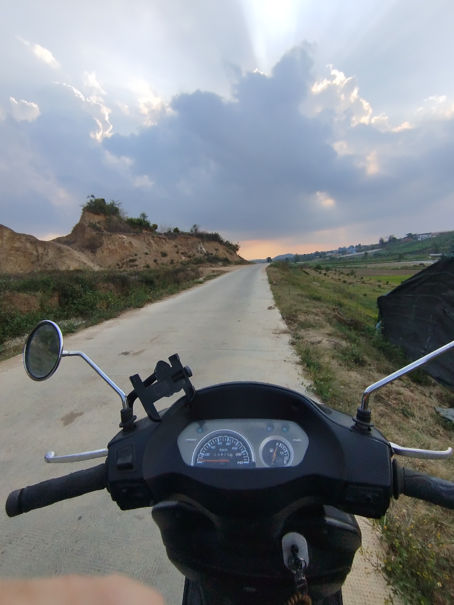 The image depicts a view from the handlebars of a scooter on a paved road in Krăng Chớ, Vietnam. A small, eroded hill is visible on the left side of the road. The road continues towards the horizon under a cloudy sky with visible sun rays. The dashboard of the scooter shows a speedometer and fuel gauge. Vegetation lines both sides of the road. A mirror and phone holder are attached to the handlebars.