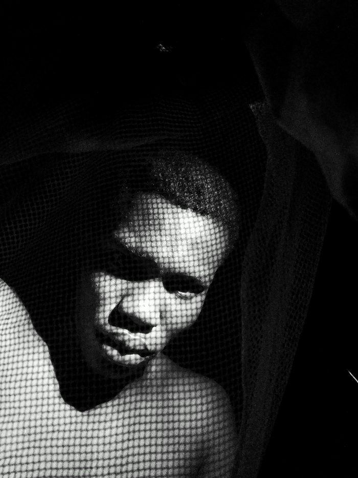 This black and white image depicts a male individual within the city of Keffi, Nigeria. A strong light source from the upper left illuminates portions of the subject's dark-skinned face and upper torso, while a net-like material casts a pronounced grid pattern of shadows across these illuminated areas. The individual's short, textured hair also shows this pattern. The head is tilted downwards and to the left, with the mouth slightly open and eyes directed downwards. The remainder of the frame, including the background and the right side, is enveloped in deep shadow, where the mesh of the net is visible as a dark, textured fabric.