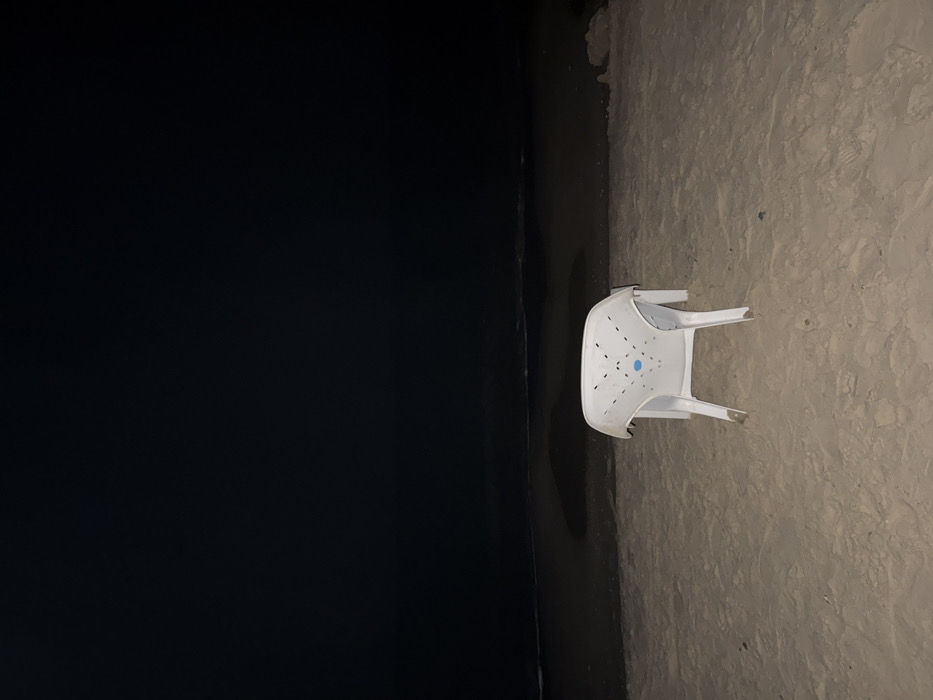 An aerial shot shows a white plastic chair sitting at the edge of a shore. The left side of the image is a vast, dark body of water. To the right, the ground is light gray, possibly sand or concrete. The chair is positioned in the center of the image with its legs extending towards the lighter ground. The overall impression is one of a stark contrast between the dark water and the light ground, with the chair as a solitary element in the scene.