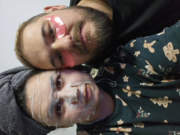 The image depicts two individuals, one female and one male, in a close-up, indoor setting. The female on the left has dark hair wrapped in a grey towel and wears a white sheet face mask covering most of her face, with cutouts for her eyes, nose, and mouth. Her eyes are dark brown and directed towards the camera. She is wearing a dark green long-sleeved top adorned with light brown patterns of gingerbread men, Christmas trees, stars, and holly berries. The male on the right has light brown hair, a beard, and a mustache. He has two pink eye masks positioned under his eyes. His eyes are directed towards the camera. He wears a dark, possibly black, long-sleeved shirt or hoodie and a thin silver chain necklace. A silver stud earring is visible in his left ear. Both individuals are positioned in close proximity, suggesting a shared activity or intimate moment. The background is an indistinct, plain, light-colored surface, indicating an indoor environment. There are no specific architectural features, landmarks, or other visual cues present within the image to identify the location as the city of Nuremberg, Germany, or any other specific geographical area.