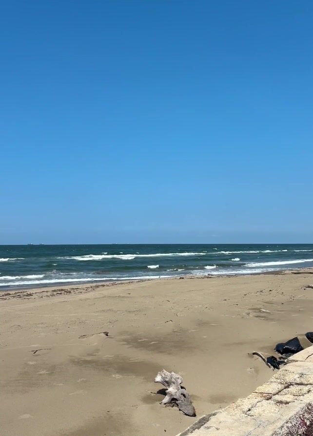 beach on a clear, sunny day. The sky is bright blue. The sand is a tan color. There is a piece of driftwood on the beach. The ocean is greenish-blue and there are small waves. There is a concrete barrier at the edge of the beach. The sound of an engine can be heard.