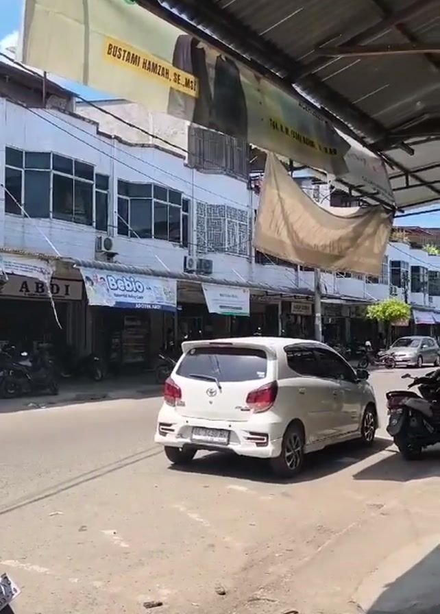 Here's a concise description of the video: The video presents a street scene in what appears to be a commercial area. A white compact car, possibly a Toyota, is parked on the side of the road. Several motorcycles are also parked nearby. The street has other vehicles moving in the distance. The buildings lining the street are mostly two or three stories high with shops and offices. Banners are hanging overhead, attached to a corrugated metal roof that appears to be the covering for the area where the video is taken from. The scene is bright and appears to be daytime.