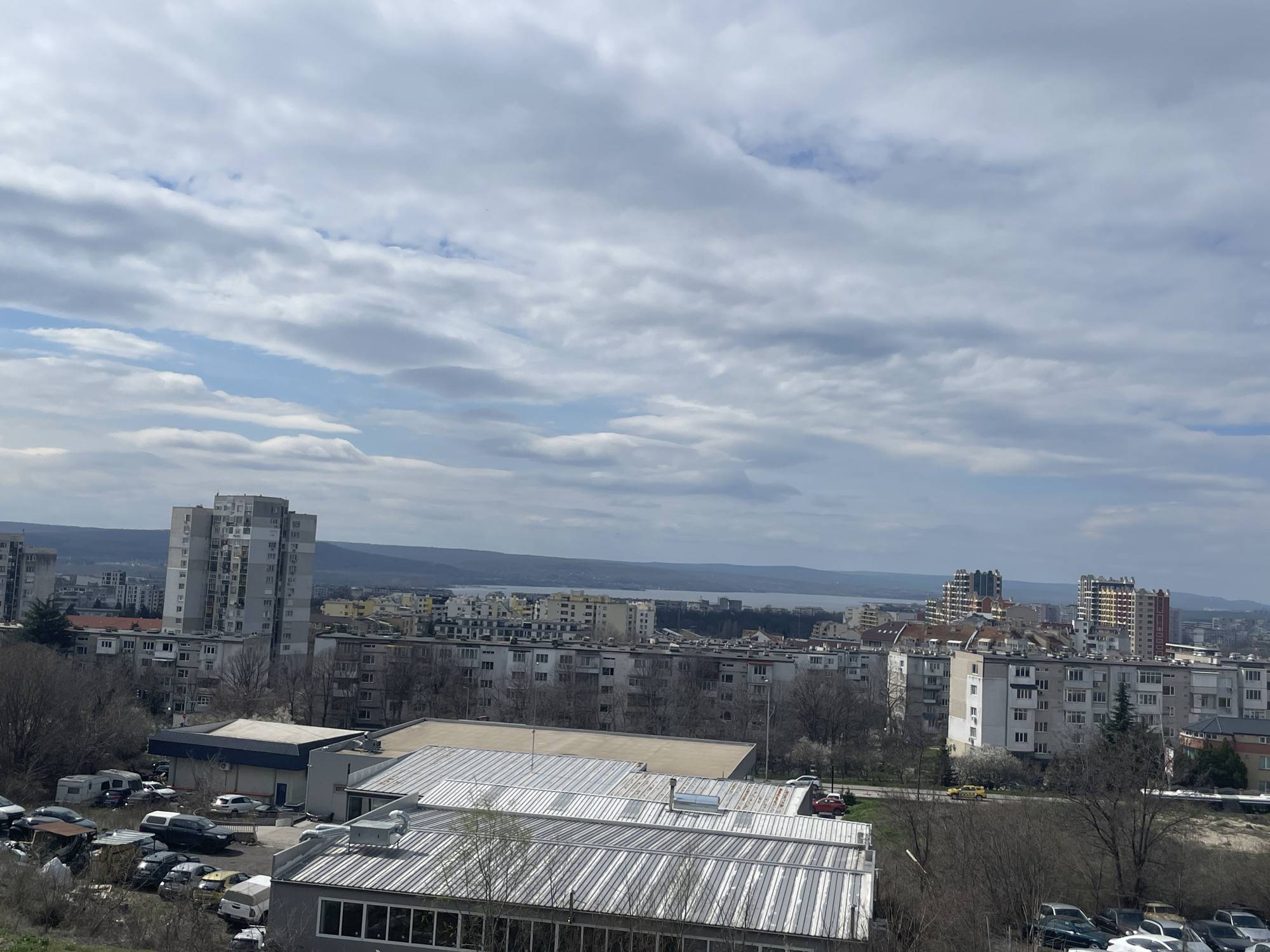 The image depicts a cityscape of Varna, Bulgaria, under a cloudy sky