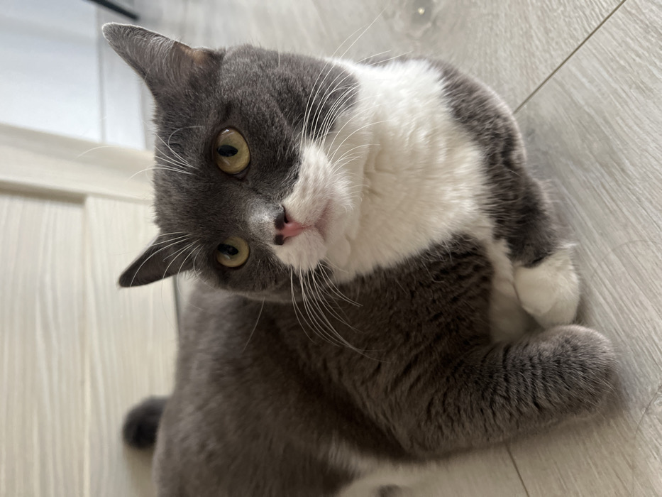 - "An indoor photograph captures a domestic short-haired cat resting on a light-colored laminate or wood-effect floor" by FM-Si4Wf1, licensed under CC BY 4.0