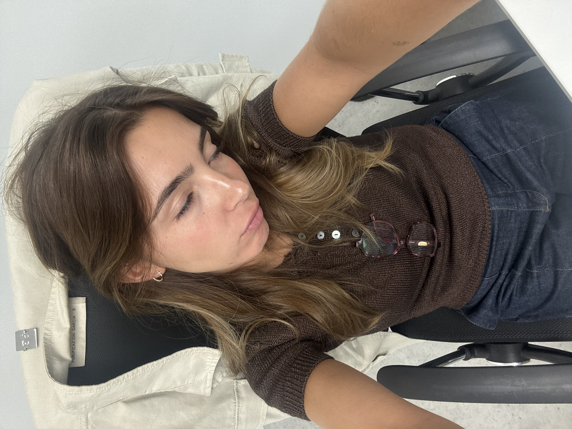 A high-angle perspective shows a female subject resting in a black office chair within an indoor environment in Torres Vedras, Portugal. The individual's head is tilted forward and left, eyes closed, indicative of sleep or deep rest. Her long, brown hair with lighter highlights partially obscures the chair's back. She is dressed in a dark brown, short-sleeved, ribbed knit top featuring light-colored buttons, and dark blue denim trousers. A pair of eyeglasses with translucent reddish-purple frames is suspended from the shirt's button placket. A gold, crescent-shaped earring adorned with a small cross is visible on her right earlobe. Behind her head, draped over the chair, is a light-colored garment, identified by a "PURIFICACION GARCIA S" label. The background is a plain, light-colored wall. A white surface, consistent with a desk, occupies the lower right of the frame.
