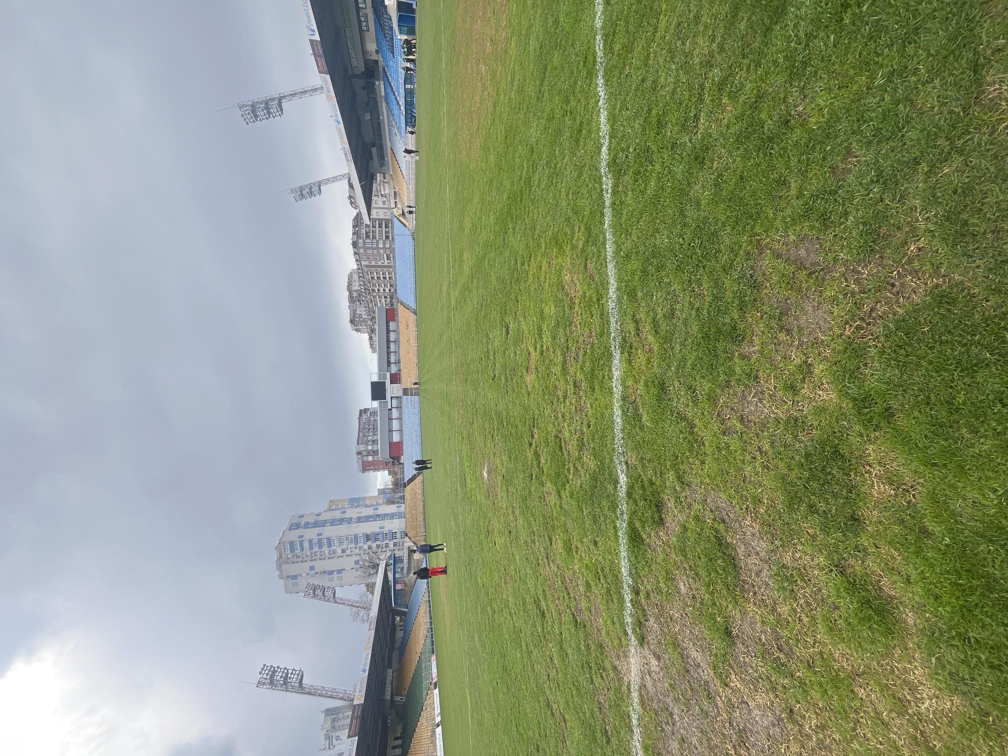 An outdoor, wide-angle image depicts the interior of Lazur Stadium in Burgas, Bulgaria, captured from pitch level. The foreground features a moderately maintained grass football pitch with a discernible white sideline marking approximately one-quarter up from the bottom edge. The grass exhibits areas of wear, with visible patches of bare earth and dried, lighter-colored grass. Scattered across the mid-ground of the pitch are several individuals. On the left side, two persons are observed standing: one in a red top and dark trousers, and another in a dark top and white footwear. Towards the center of the pitch, a cluster of three individuals stands. On the right side, a larger group of approximately eight to ten individuals, some dressed in green sportswear, are gathered near what appears to be a dugout or entrance to the stands. Another isolated individual in white attire is visible further back on the right. The stadium's multi-tiered stands encircle the pitch in the background. The left-hand stands display a combination of yellow and blue seating, while the right-hand stands predominantly feature blue seating. Elevated floodlight towers, characteristic of a sports arena, are positioned above the stands on both the left and right sides. Sponsor banners with partially visible text, including "invest.bg," are affixed along the top edge of the stands. Beyond the stadium structure, various urban buildings are visible against an overcast, grey sky. A prominent, tall, multi-story building with a light-colored facade and blue window sections stands out behind the left-hand stands. Other residential or commercial buildings of varying heights complete the background skyline.