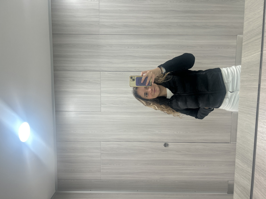 The image captures a mirror selfie taken indoors in Interlomas, Mexico. A female subject, appearing to be in her mid-20s to early 30s, is centered in the frame, visible from her upper thighs upward. She possesses long, wavy light-brown hair and looks directly into the mirror with a slight smile. The subject is dressed in a black, padded jacket over a white undershirt, paired with white pants or a skirt. She holds a light-colored smartphone with a purple accessory attached to its back in her left hand, partially obscuring the left side of her face. Her right hand is not fully visible but appears to be tucked into the jacket pocket. The background consists of light-grey, vertically oriented wood-grain panels, resembling cabinet doors or wall cladding. A small, circular metallic handle is visible on one panel to the left of the subject. In the foreground, a light-colored, flat surface, likely a vanity or counter, reflects the subject's lower half and the upper environment. A bright, circular overhead light fixture is prominently visible in the upper left quadrant of the image, emitting a strong glare.