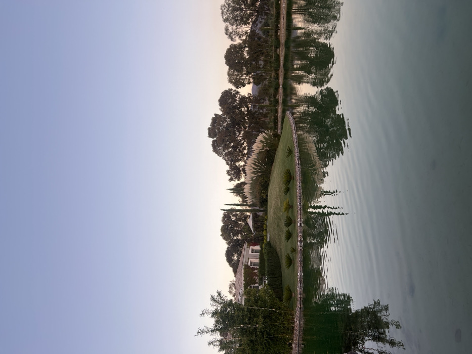 A tranquil scene with a body of water mirroring the landscape. Lush greenery lines the water's edge, including trees and manicured lawns. A house nestles among the vegetation. The sky transitions from a pale blue to a hint of sunset hues near the horizon. The water surface reflects the trees and plants, creating a layered and symmetrical composition.