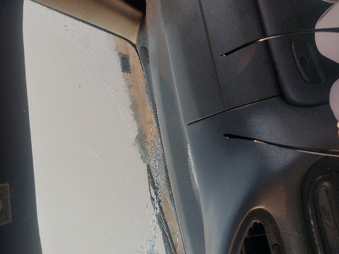 interior of a car. The windshield is cracked, and the outside is visible through it, showing trees and a blurred background. The dashboard and interior are dark grey. A pair of glasses is resting on the dashboard, partially visible. Air vents and other car controls are also visible.