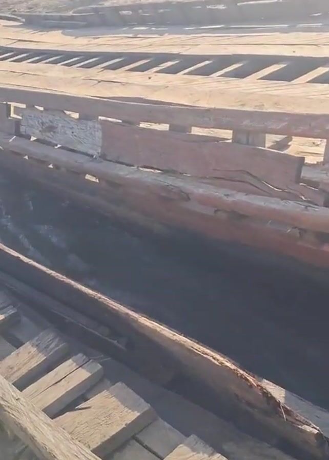 man sanding the inside of a wooden boat. The boat is resting on a wooden scaffolding-like structure. The man is wearing orange shorts and sanding with a small electric sander. The boat appears old and the wood is weathered. In the background, there is a sandy area with some green vegetation. The video seems to be taken during a sunny day.