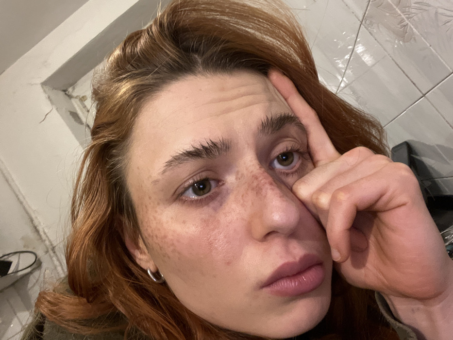 A close-up selfie shows a woman with red hair and freckles, gazing into the camera with a weary expression