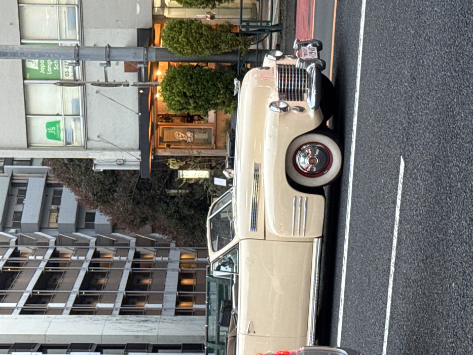 The image depicts an urban street scene in Shibuya, Japan. A cream-colored vintage convertible automobile, identified as a 1940s Cadillac with its soft top down, occupies the mid-ground, facing right. The vehicle exhibits chrome trim, a prominent grille, and whitewall tires with red-ringed hubcaps. A driver is present within the vehicle. The asphalt road surface beneath the vehicle features white lane delineation and a red painted section to the right. In the background, two primary structures are visible. To the left, a multi-story building with a facade of staggered balconies and external staircases shows interior lights. To the right, a lighter-toned building houses commercial spaces. Its ground floor features a café entrance with warm internal illumination and prominent green shrubbery. The upper level displays signage for 'JS Language' and 'Japan Language School' alongside a telephone number '03-627'. A large deciduous tree with reddish leaves is situated between these structures. A gray utility pole stands vertically on the right side of the frame.