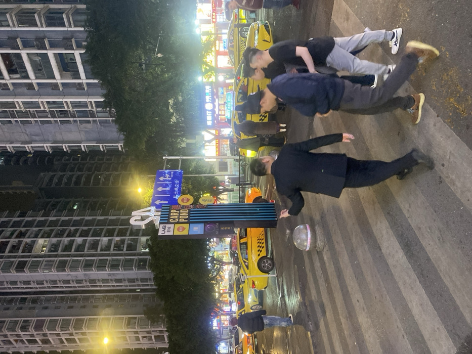 A street scene at night depicts several men in various positions. One man, dressed in a suit, is bending over near a bollard. Above him, two other men appear to be doing push-ups on the crosswalk. Taxis line the street behind them, with buildings rising on the left. Streetlights and neon signs illuminate the scene, suggesting an urban, possibly Asian, setting.