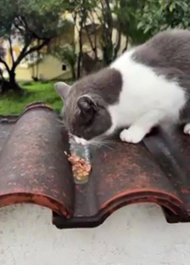 gray and white cat eating out of a small, clear container that has been placed on top of a red, tiled roof. The cat is bending over to reach the food, which appears to be wet cat food. In the background, there's a green lawn, trees, and buildings. The weather looks overcast.