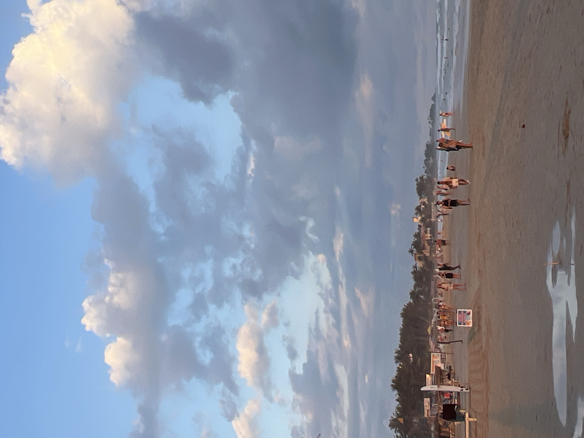 The image displays a wide sandy beach at Kabalana, Sri Lanka, observed during what appears to be late afternoon or early evening. The sky features extensive cloud cover, comprising large grey and white cumulus clouds interspersed with patches of light blue. The beach itself is a broad expanse of light brown sand, where numerous individuals and small groups are walking and congregating. In the left midground, several informal structures, resembling shacks or stalls with wooden frameworks and corrugated roofs, are visible near a line of dense palm trees and tropical foliage. A white surfboard leans against one structure, and a freestanding rectangular sign faces the viewer from the sand. Further back, buildings with visible roofs are situated amidst the vegetation. Towards the right side, the ocean shows moderate waves breaking near the shore, with multiple people present in the water; one individual is seen holding a surfboard. In the immediate foreground, several shallow puddles of water are present on the sand. The approximately 30-40 discernible individuals are dressed in casual beachwear.