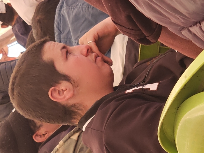 The image presents a close-up, profile view of a young individual seated in a crowded, sheltered environment in Azrou, Morocco. The subject has short, dark brown hair and is looking towards the right side of the frame. Their right hand rests against the lower face/chin area, with a silver-colored ring visible on the ring finger. The individual wears a dark brown or black zipped jacket with a white "1" insignia on the left chest area and a white collar or trim underneath. In the immediate foreground, a bright green plastic chair is partially visible on the lower left. The background is blurred, showing parts of several other individuals and elements of a light-colored tent or canopy structure. To the left, a person's dark-haired head and a dark-clothed shoulder are visible. To the right, another person's dark-haired head and a light blue denim-like jacket are discernible. An arm in a dark brown padded garment is visible in the lower right.