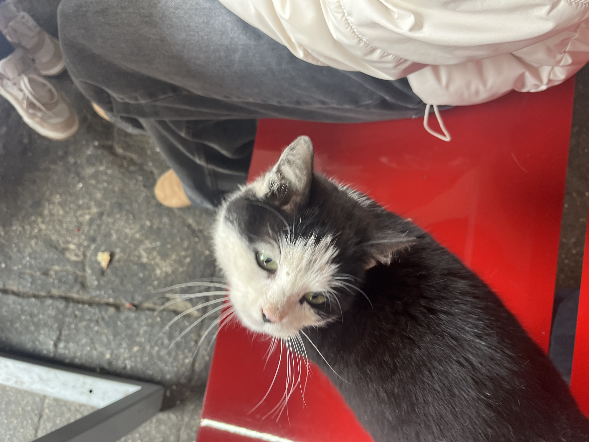 black and white cat sitting on a red surface, likely a chair or bench, next to a person wearing gray jeans, a white jacket, and tan sneakers