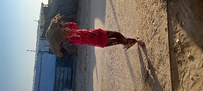 The image depicts a child walking on a dirt and sand surface in what appears to be a makeshift camp environment in Khan Yunis, Palestinian Territory. The child, wearing a pink long-sleeved top, dark patterned trousers, and light-colored sandals, carries a large, irregularly shaped object resembling a bundle of burlap or coarse fabric balanced on their head, secured with both hands. The child's head and upper face are obscured by the carried object. The ground consists of light brown, uneven dirt and sand. In the immediate foreground, a wooden beam separates a lower section of sand containing scattered litter, including small pieces of plastic and paper. Long shadows are cast towards the lower left, indicating strong sunlight from the right. In the background, several temporary structures are visible under a clear, light blue sky. A prominent structure to the left features a white or light blue tarp covering a roof, with walls constructed from what appears to be corrugated metal or wooden planks. Further behind and to the right, other less defined structures, possibly additional tents or makeshift shelters, are present. A thin, dark vertical pole stands between the child and the main background structure.