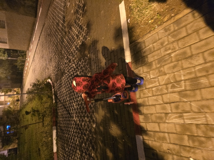 A person on a scooter rides on a brick sidewalk next to a brick-paved road. The individual wears a red and black patterned jacket and blue shoes. To the left of the road, there's grass and trees, with a building visible in the distance. The lighting suggests it's nighttime. The angle gives a high, slightly tilted view of the scene.