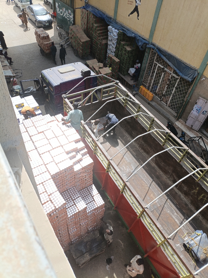 An aerial view captures a commercial loading operation on a paved street in Fagge C, Nigeria, under direct sunlight