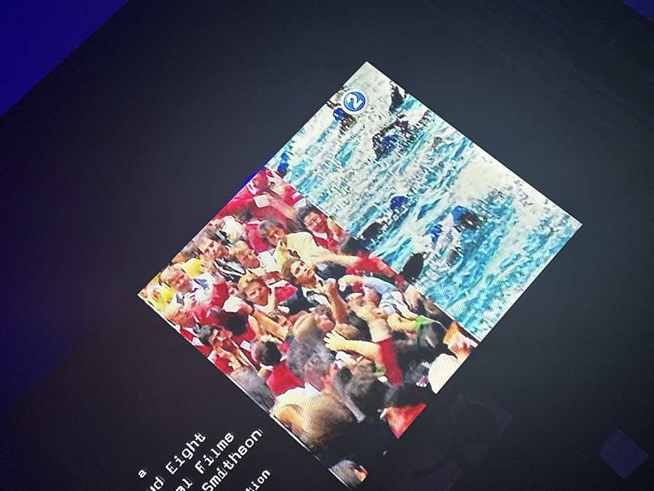 A tilted square displays two images spliced together. The bottom half shows a crowd of people cheering, many wearing red. The top half depicts swimmers in a race, churning through blue water. A small logo is visible in the upper corner. Text at the bottom edge reads "a David Eight Film Smithsonian." The background is dark, possibly a screen.
