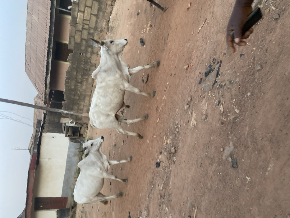 Two white Ankole-Watusi cattle stand on a dusty, reddish-brown ground, possibly a dirt road. A hand holding a black object is in the top-right corner. The cattle are facing different directions, with the larger one looking upward. A building with a brick wall and corrugated metal roof is visible in the background. A pole stands tall next to the building. The scene suggests a rural setting.
