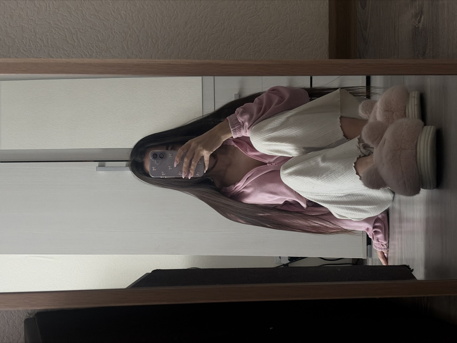 The image displays an indoor scene in Novosaratovka, Russia, captured as a reflection in a large mirror with a brown wooden frame. A single individual, appearing to be a young female, is seated on a wooden floor, facing the mirror. Her face is obscured by a smartphone held in her left hand, which is equipped with a light-colored case adorned with a bow pattern. Her fingernails are manicured and painted a pale color. She has long, straight, dark brown hair that cascades over her shoulders and chest. She is wearing a light pink hooded zipper jacket, partially unzipped, and light-colored, ribbed, wide-leg pants. On her feet are fluffy pink slippers featuring ear-like elements. The reflected background includes a white two-door wardrobe with a silver handle and a light-colored, textured wall. A dark, indeterminate object is partially visible on the far left of the reflection. The floor beneath the individual is constructed of wooden planks.