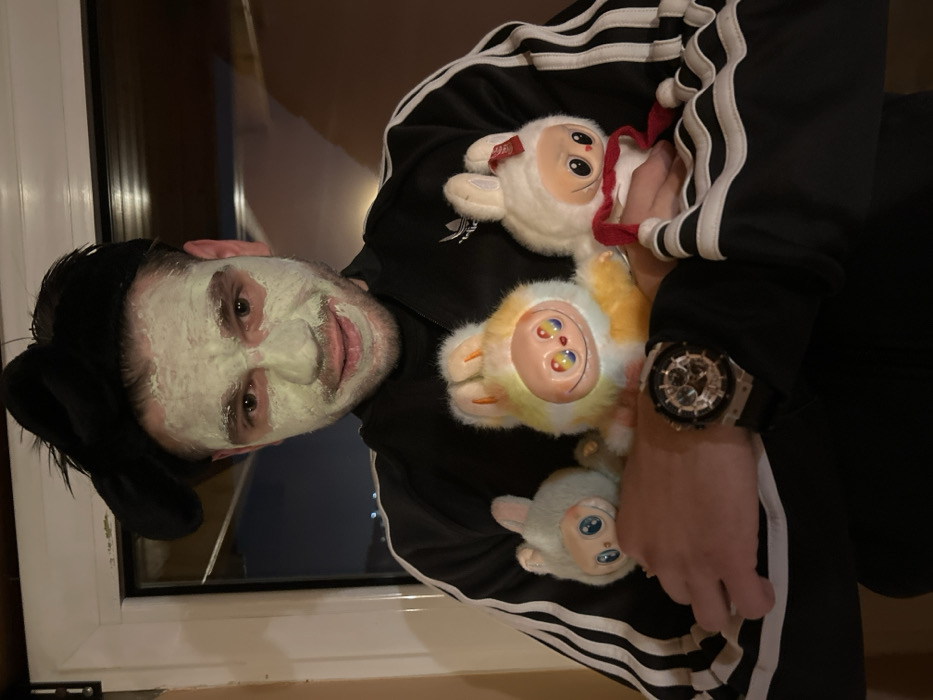 An adult male subject is depicted indoors in the Gerakas Municipal Unit, Greece, posing directly for the camera. His face is covered with a light green facial mask, revealing his eyes and a partial smile. He wears a black, soft, plumed hat and a black Adidas track jacket with white stripes. On his left wrist, he has a prominent skeletonized chronograph watch. He holds three distinct plush toys: a light blue bunny-eared figure with large blue eyes, a multi-colored bunny-eared figure with rainbow-hued eyes and a wide smile, and a white bunny-eared figure wearing a red scarf and a Coca-Cola tag. Behind him is a window looking out onto a dark, nighttime urban landscape.