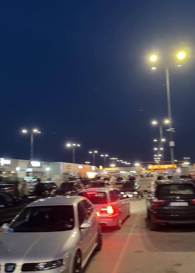 crowded parking lot at dusk