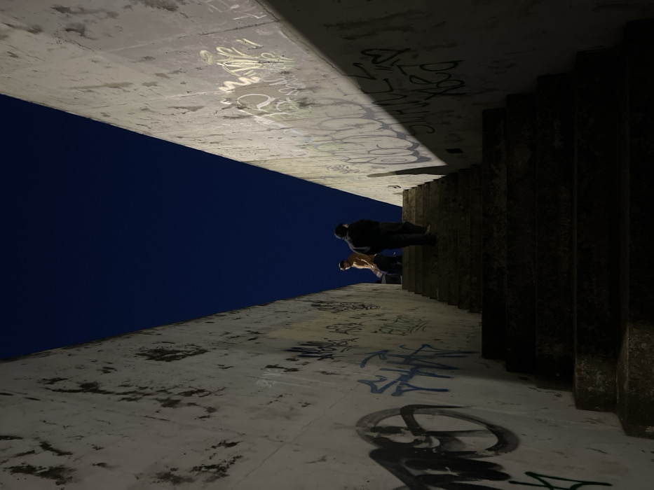 The image depicts a concrete pedestrian staircase at night in Bragança, Portugal. The perspective is from the bottom of the stairs, looking upward towards the street level. Two individuals are positioned near the top of the staircase. The person on the left wears a light brown or orange hooded sweatshirt and a white face mask, standing still. The person on the right, dressed in dark clothing, is descending the stairs, with their back partially turned towards the camera. The concrete walls flanking both sides of the staircase are heavily adorned with graffiti in various colors, including blue, black, white, and green. The ambient light is dim, indicating nighttime, with an artificial light source illuminating the upper sections of the walls and the individuals, casting shadows on the right wall and the lower steps. The visible sky at the top of the passage is a deep blue.