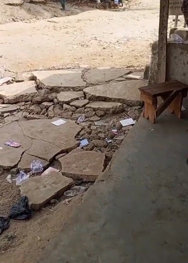 The scene shows a damaged street or sidewalk with large cracks and displaced concrete slabs. There is trash scattered throughout the cracks. A small wooden stool sits on a section of intact pavement in the foreground. In the background, there are people near a tree and a building with a satellite dish. The footage is taken from under a covered area, and a person is standing to the right of the frame. The music in the background adds to the scene, suggesting it could be a marketplace.