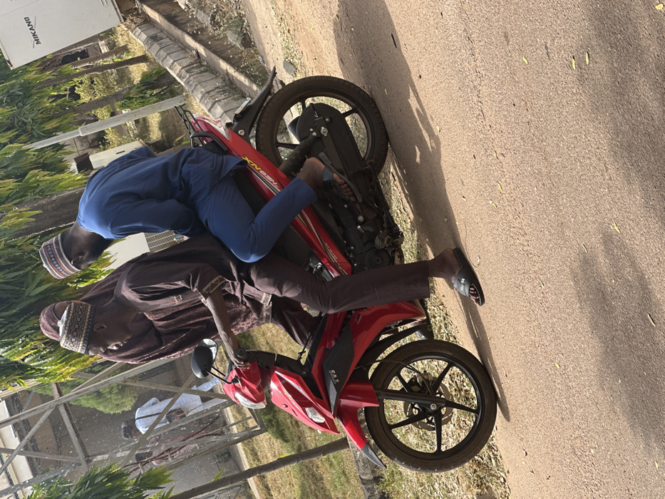 Two men are depicted on a red TVS Neo NX motorcycle on a light brown unpaved road in Tudun Nupawa, Nigeria