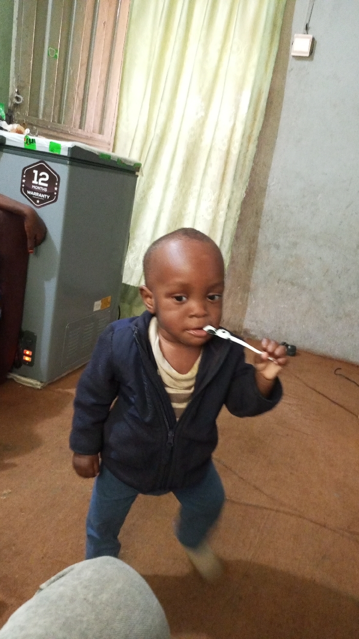 This image captures an indoor scene in Unguwan Dosa, Nigeria. A young child with dark skin and a closely cropped head stands in the center foreground, facing directly toward the camera. The child is dressed in a dark blue zippered jacket, a light-colored striped long-sleeved shirt, and blue trousers. The child holds a white and black utensil, possibly a toothbrush or a small spoon, to their mouth with their right hand. The child's left foot appears blurred, suggesting motion. To the left of the child, a gray chest freezer is visible, featuring a circular "12 MONTHS WARRANTY" sticker and an illuminated orange indicator light on its lower front. A partial view of a dark-skinned adult's arm with red nail polish on one finger is visible, resting on or near the top of the freezer. Behind the freezer, a window with vertical bars and light-colored patterned curtains is present. The background consists of a light gray wall extending to the right, partially covered by the same light-colored curtains. A white rectangular object is mounted high on the wall on the right side. The floor is a reddish-brown, appearing to be tiled or concrete with visible lines. A soft, gray object, possibly a part of furniture or another person's leg/foot, is in the lower-left foreground.