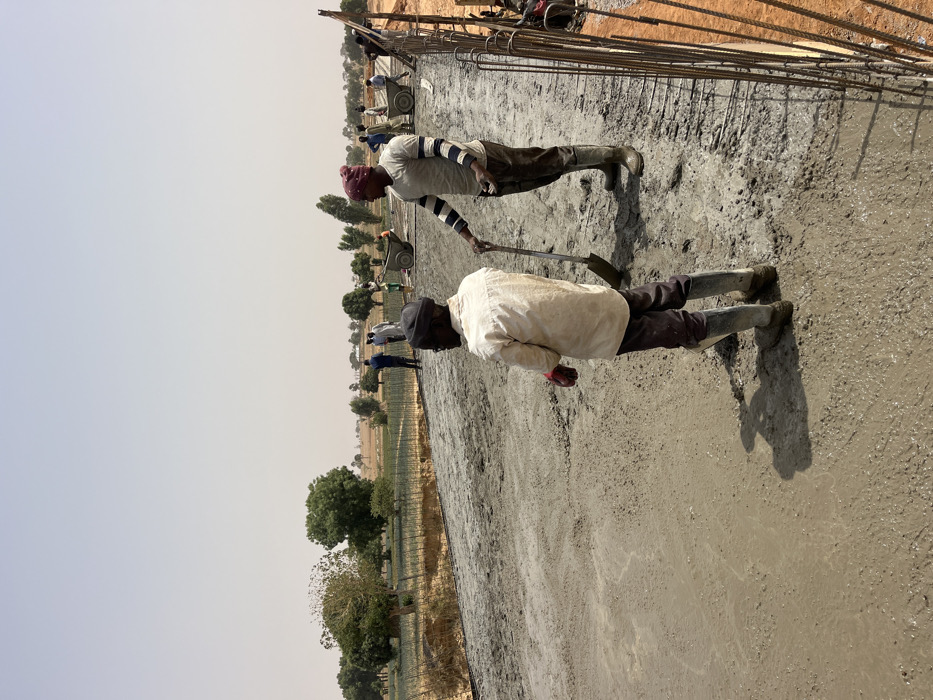 The image depicts an active concrete pouring operation in Gyellesu, Nigeria
