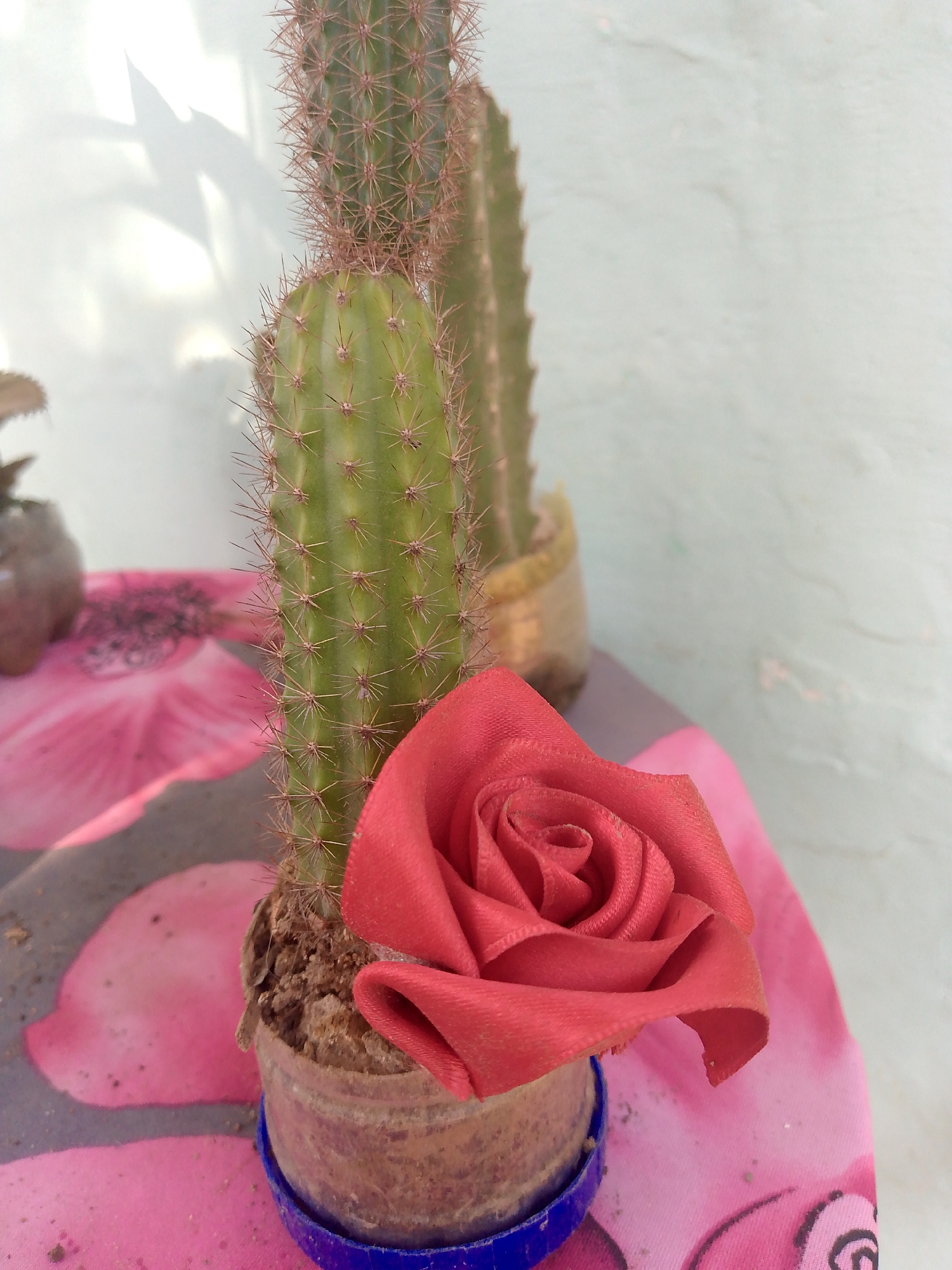 - "A close-up shot shows a small cactus plant in a clear plastic pot, decorated with a large red fabric rose" by FM-Oe2JJ3, licensed under CC BY 4.0