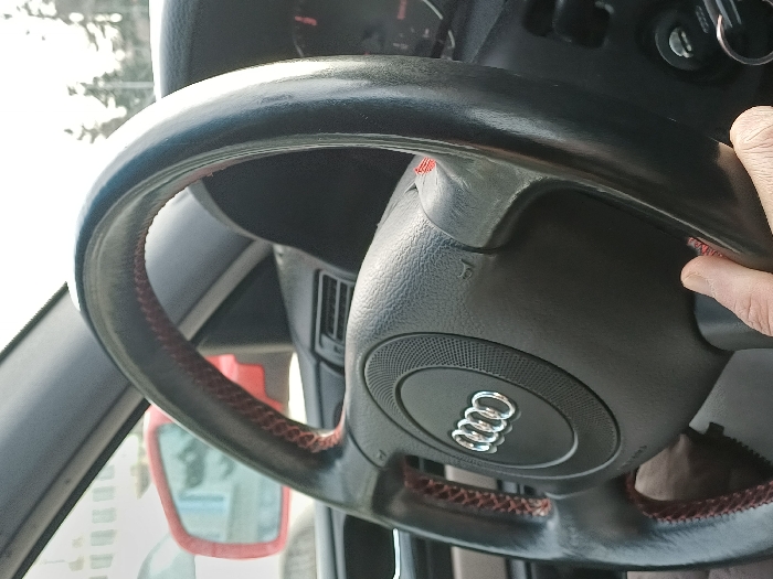 The image captures a driver's perspective from within an Audi vehicle, located in Dolna Oryahovitsa, Bulgaria. A light-skinned human hand is gripping the lower-right portion of a black steering wheel. The steering wheel features distinct red cross-stitching along its inner circumference on both sides and displays a chrome Audi logo (four interlocked rings) centrally on its airbag cover. Minor surface wear is evident on the upper right quadrant of the steering wheel. A set of keys on a metal ring is inserted into the ignition cylinder, positioned to the lower right of the steering wheel. The vehicle's dark gray dashboard and air vents are partially visible. Through the windshield, a segment of a red vehicle is observed on the left. Light-colored buildings are reflected in the passenger-side mirror. Evergreen trees are visible against a bright, possibly hazy, sky in the background.