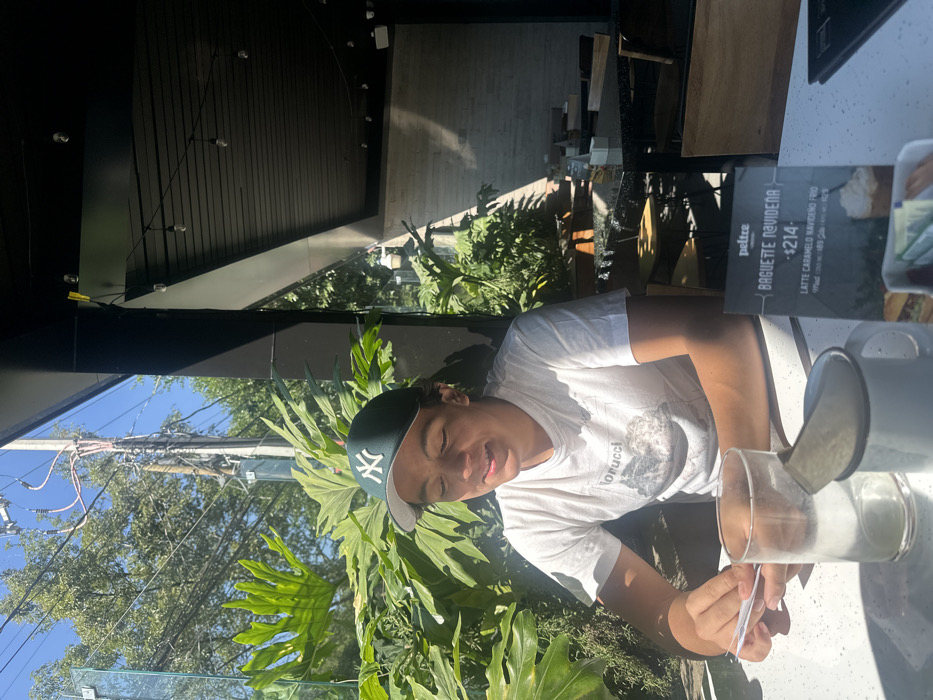 A person wearing a New York Yankees baseball cap and a white t-shirt is sitting at an outdoor cafe. A menu describing a "Baguette Navideña" and a "Latte Caramelo Navideño Frio" is visible on the table. A glass with a metal lid is on the table and appears to contain a white powder. Lush green tropical plants are visible in the background, along with a glimpse of the sky and power lines.