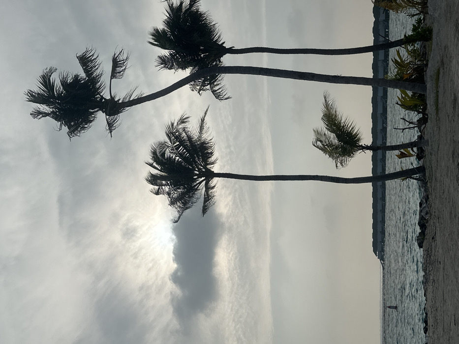 Four palm trees line the horizon, bent by the wind against a cloudy sky