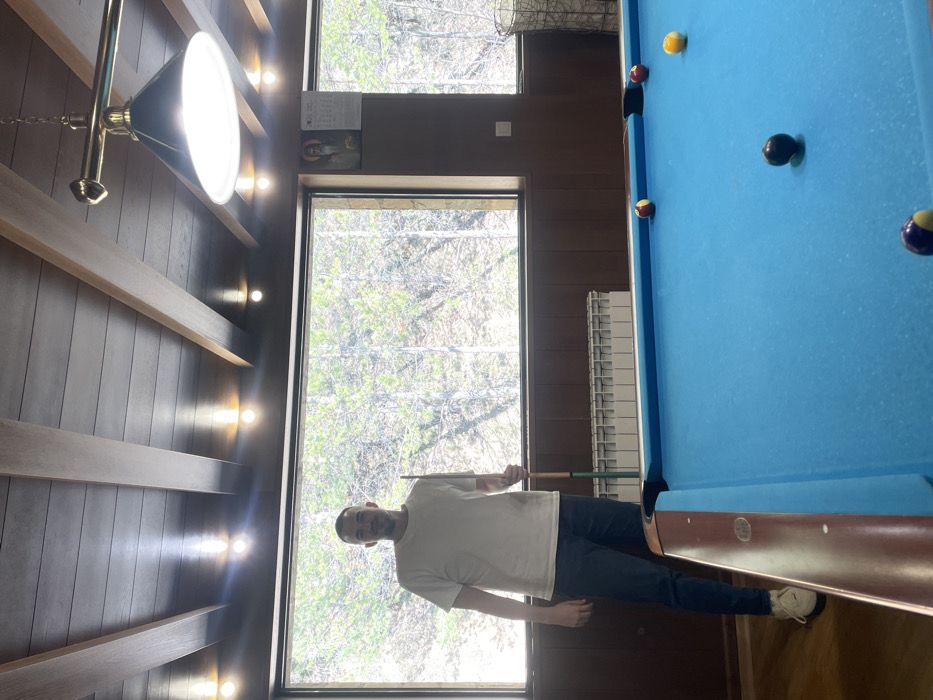 The image depicts an indoor recreational space located in Kladnitsa, Bulgaria. A single Caucasian male, dressed in a white t-shirt, dark blue jeans, and light-colored sneakers, stands on the left side of the frame. He holds a green two-piece pool cue vertically with his right hand, resting the butt end on the floor, and faces the camera with a neutral expression. In the foreground and extending to the right, a pool table with a light blue felt surface and dark wooden rails is visible. Scattered on the table are a black 8-ball, a yellow solid ball, a red solid ball, and a purple striped ball. Behind the male subject and the pool table, a long, horizontal window dominates the background, showcasing a dense green forest outside. Below this window, a white heating radiator is installed along the wall. The lower section of the interior wall is constructed from dark wood paneling. To the right of the window, a framed religious icon is affixed to the wall, with a calendar suspended directly beneath it. A large, mesh-like cylindrical container is situated in the far right background. The ceiling is dark with parallel light-colored wooden beams and integrated recessed spotlights. A prominent brass-finished light fixture, featuring a dark conical shade, hangs above the pool table area. The room is illuminated by both natural light from the exterior and artificial lighting sources.