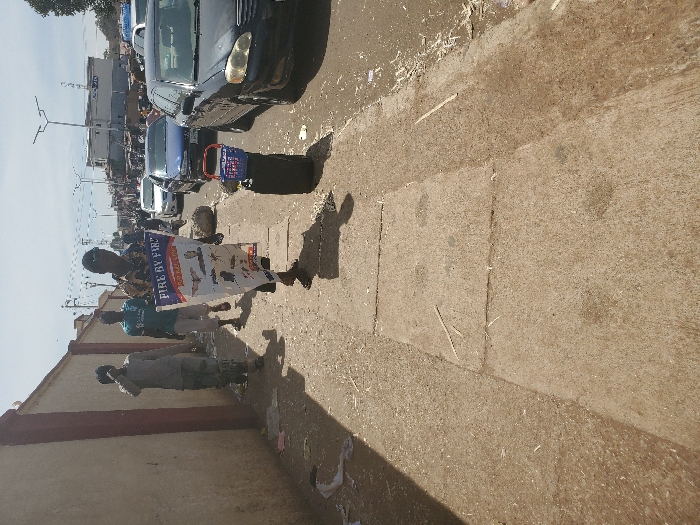 This image depicts a daytime urban street scene in Jos, Nigeria, characterized by a busy sidewalk adjacent to a paved road with vehicular traffic. Four males are visible on the sunlit sidewalk. In the foreground, a man wearing a patterned long-sleeved shirt and sandals walks towards the observer's right, holding a tall, vertical banner. The banner features "FIRE BY FIRE" at the top, "PRAY KILL & CUT..." below, and illustrations of various insects and small animals, including a bat, mosquito, scorpion, and snake. To the banner-holder's immediate right, at the edge of the road, a dark, possibly wheeled container serves as a base for a blue plastic basket containing small, packaged items. Behind the banner-holder, two additional men walk on the concrete portion of the sidewalk: one in a light grey long-sleeved shirt and trousers, and the other in a blue t-shirt and light-colored shorts. A fourth individual is partially visible further back on the left side of the sidewalk. The left periphery of the scene is bordered by a light brown wall with a darker horizontal trim, fronted by a dirt strip of the sidewalk scattered with debris, including wood shavings and litter. The paved road on the right contains several vehicles, including a black Toyota Corolla, a blue sedan, and a white sedan, indicating active traffic. The background shows utility poles, power lines, streetlights, and various buildings under a bright, clear sky.