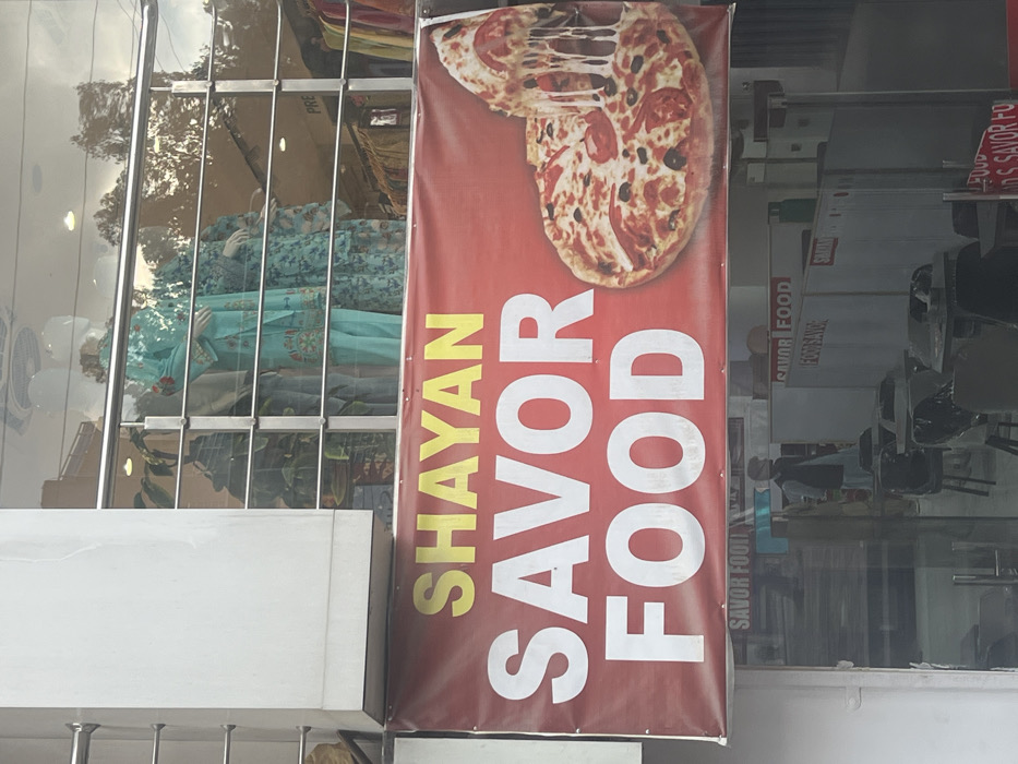 - "A red banner advertising "SHAYAN SAVOR FOOD" with yellow and white lettering is affixed to the exterior of a building in Mansehra, Pakistan" by FM-W2DEQ2, licensed under CC BY 4.0