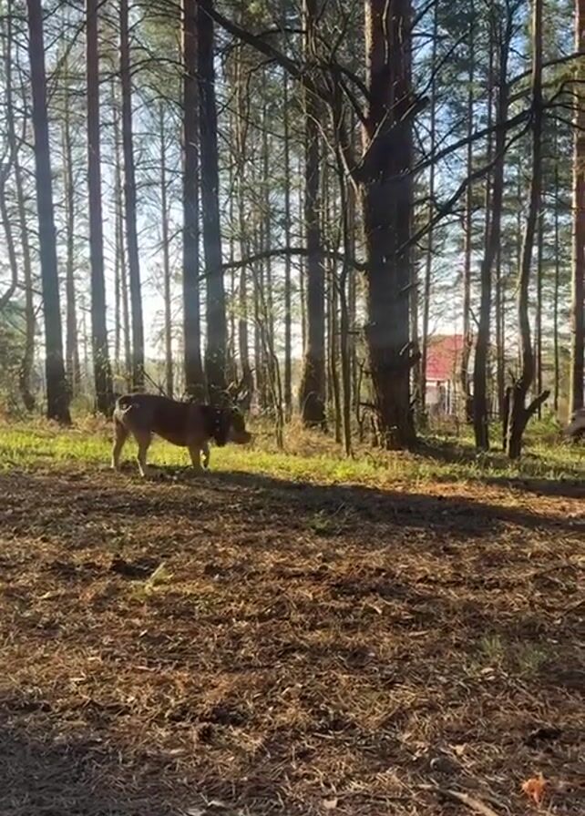 A large brown dog is sniffing the ground in a forest clearing with tall, thin trees and a scattering of green grass. Another, lighter-colored dog rushes in, and they briefly meet before the brown dog continues exploring the area. The ground is covered in brown leaves and pine needles. Sunlight filters through the trees, creating long shadows on the ground. In the background, a house with a red roof is visible through the trees.