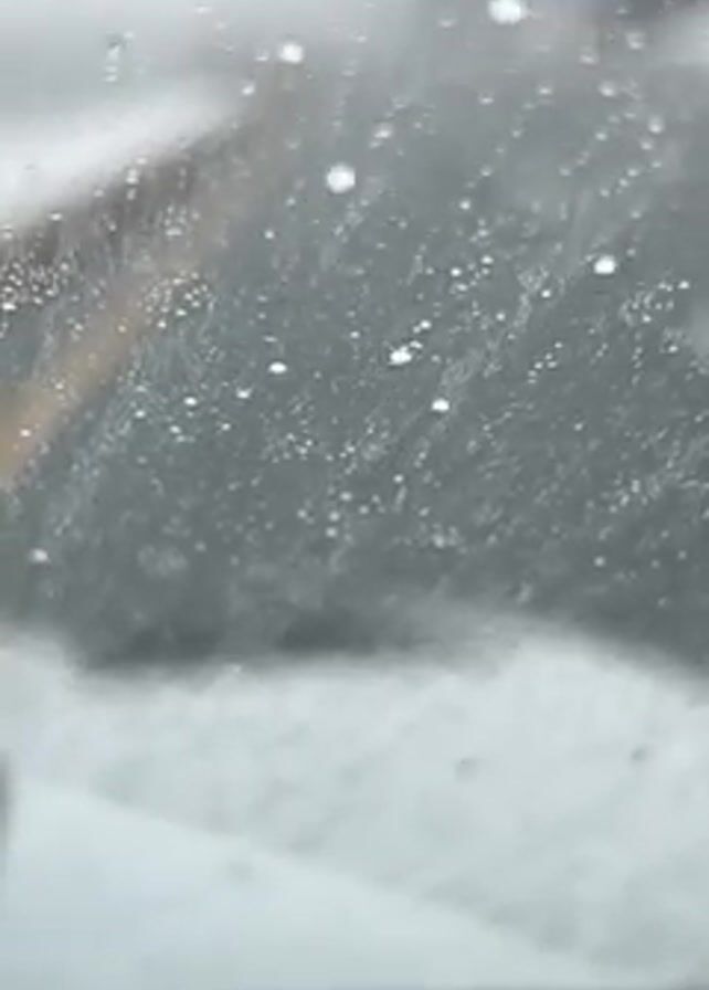 view from inside a car during heavy snowfall. The windshield is covered with droplets and slush, obscuring the view of the road ahead. A yellow line is visible on the road, indicating a lane marker. The wipers are not activated.