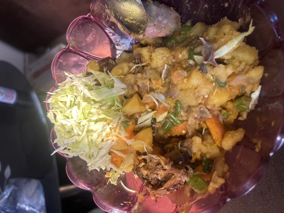 A translucent, fluted pinkish-purple bowl, located in Narayi, Nigeria, is centered, containing a meal. The dish consists of a stew-like mixture of diced light-yellow potatoes or yams, chopped orange carrots, and green bell peppers, intermingled with flaky, brown pieces of fish, some exhibiting bone fragments, all within a reddish-orange sauce. A substantial topping of thinly shredded light-green cabbage is present on the upper portion of the meal. A metallic spoon, partially coated with food residue, rests on the right interior edge of the bowl. The background is dark, blurred, and indistinct, with a solitary, out-of-focus object, possibly a can, visible in the upper background.