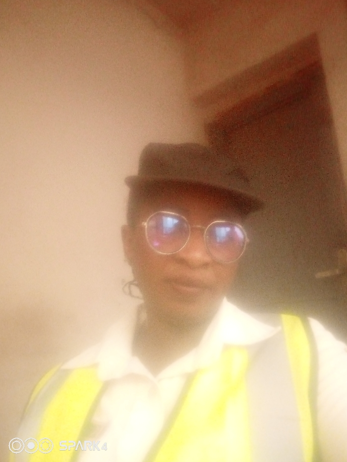 A person wearing a dark hat and round glasses looks at the camera. They are wearing a white collared shirt and a yellow safety vest. The image is slightly blurry and has a warm tone. A partially visible wooden doorframe is in the upper right corner. The lower left corner contains a watermark that reads "000 SPARK4".