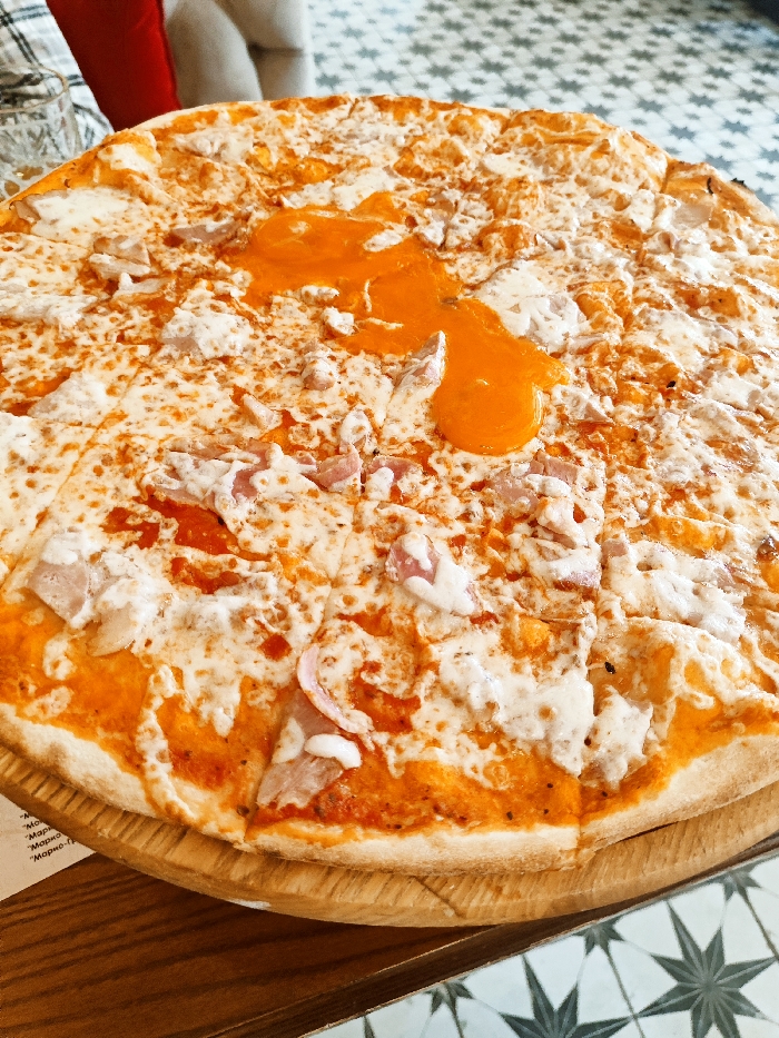 A large, round pizza, sliced into multiple portions, is centrally depicted on a light-colored wooden pizza board. The pizza is topped with melted white cheese, a tomato sauce base visible underneath, and scattered pieces of light pink and white cooked meat, consistent with ham or bacon. Two distinct, unbroken raw egg yolks are prominently featured on the pizza's surface, one slightly larger and more central than the other. The pizza board rests on a dark brown wooden table. A white menu with Cyrillic text is partially visible beneath the pizza board on the left. The background features a patterned floor or surface with a repeating star-like geometric design in light grey and white. In the upper left background, indistinct blurred shapes, including a red object and a clear patterned glass, are present. The scene is located in the city of Yevpatoriya, Ukraine.