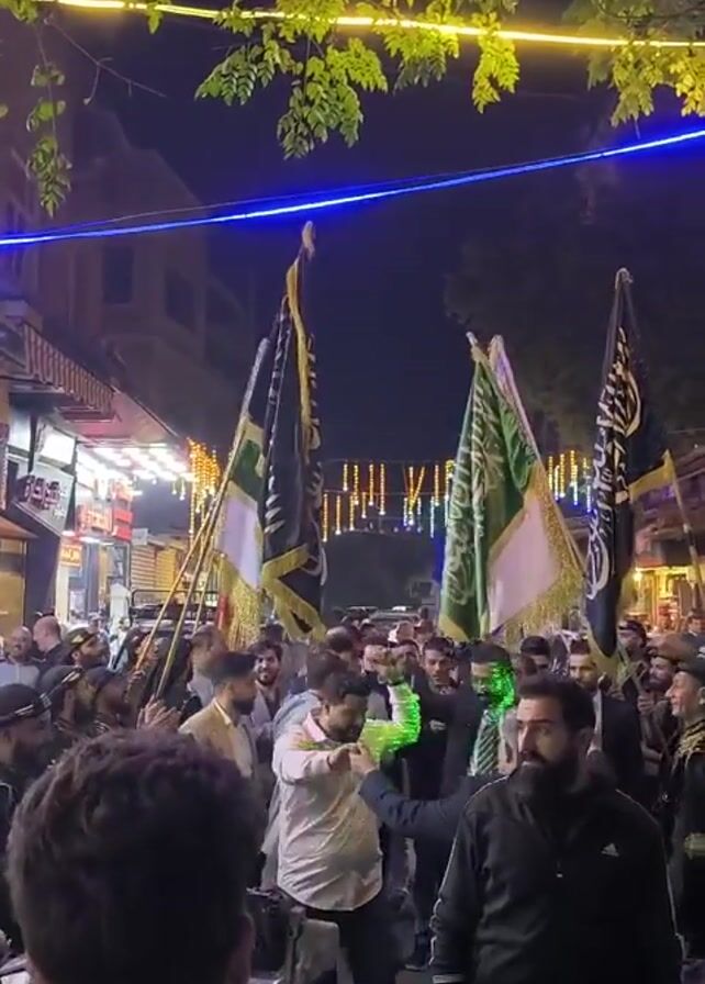 street scene at night with a large group of people gathered together. Many people are holding flags, including a green, white, and red flag and a black flag with white lettering. Some people are playing musical instruments, including drums. People are dancing and appear to be celebrating. String lights hang overhead. Shops line the street on the left. There are trees to the right.