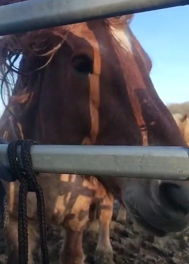 A close-up video shows a brown horse standing near a gray metal fence on a sunny day
